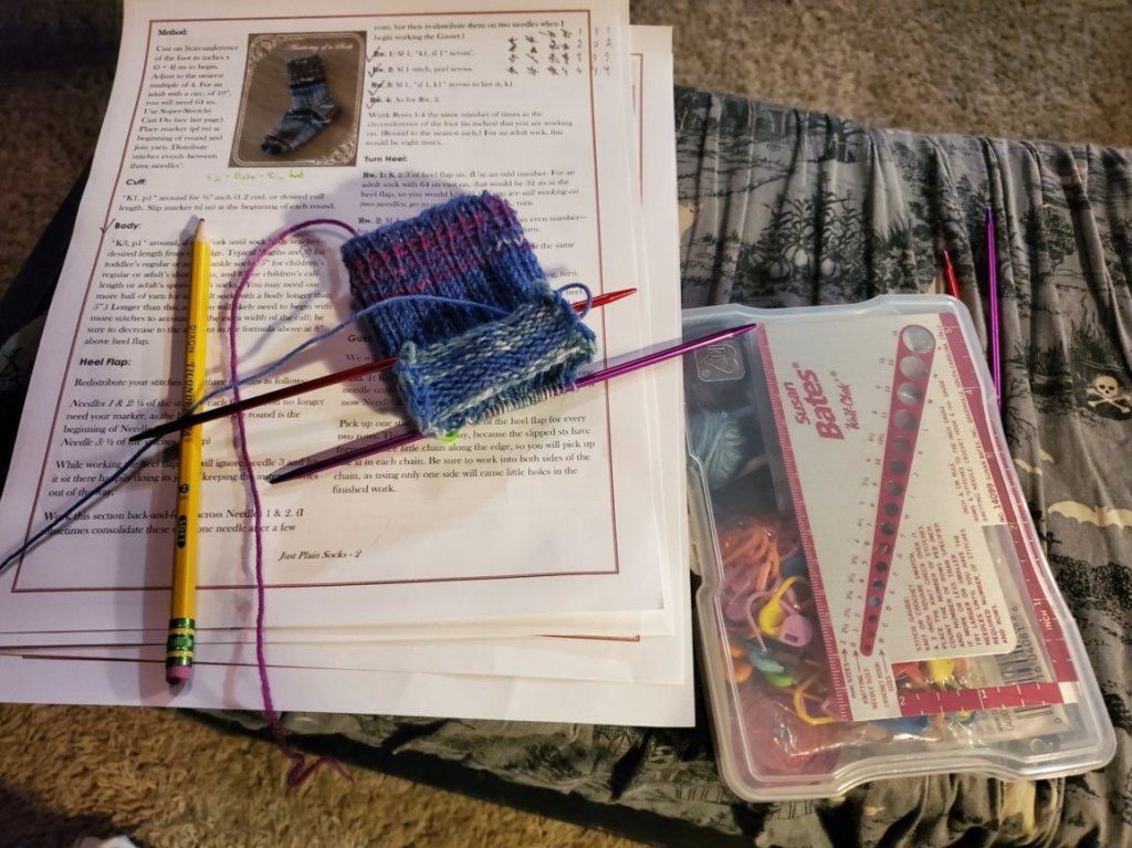 As for the sock yarn, I finished my first ever pair of socks this week. My kids got me some cheap basic sock yarn for the holidays and in return I’m knitting them each a pair of socks. Partly, I’m the nicest most generous mom ever and partly I’d rather practice on my kids’ socks than my own. They won’t care about all the minor mistakes. And there were a lot of minor mistakes. Double pointed needles, tiny stitches, lots of new shaping to learn, I was bound to screw it up. But they look like socks and work like socks and they fit my kid’s feet pretty well. She loves them and I’m pretty pleased with myself. The socks were a bright spot in a tense and gloomy week. I hope your week, too, has bright spots amid the January gloom.