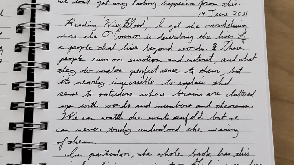 I found the writing style captivating. In my journal I wrote “I get the overwhelming sense that O’Conner is describing the lives of people that live beyond words. These people run on emotion and instinct. What they do makes perfect sense to them but it’s nearly impossible to explain that sense to outsiders whose brains are cluttered up with words and numbers and theorems. We can watch the events unfold but we can never truly understand the meaning of them.” It was a challenge, but a good one, to put myself in these characters’ shoes and understand the world through their eyes.