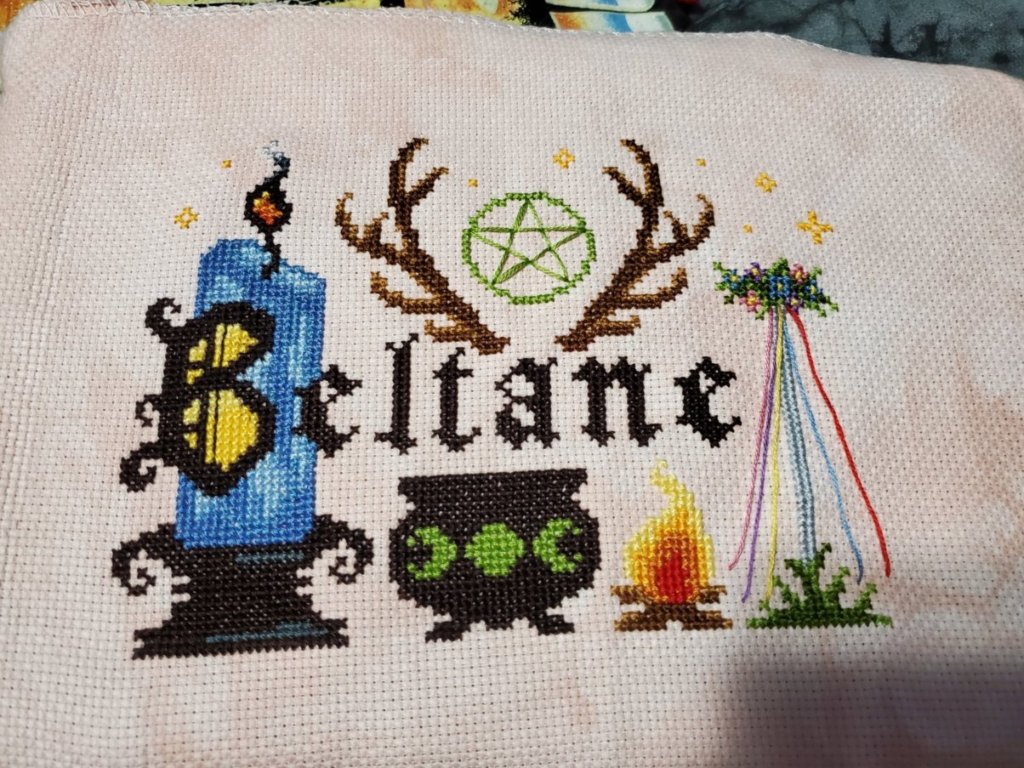 I finished Beltane, the last in my set of Sabbat cross stitch patterns. There were a couple odd color mistakes in the pattern–first I figured out one of the symbols was used for two different shades of yellow, then I found the same problem with two different shades of red. I just sort of chose the shade I thought would work and I’m mostly satisfied with the results.
