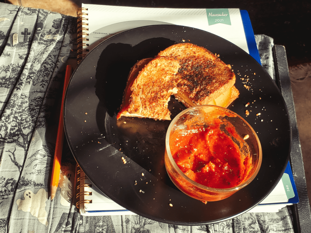 This, my friends, is a grilled cheese sandwich with tomato dipping sauce. It’s got smoked gouda and multigrain bread with garlic salt, and the sauce has extra spicy paprika and Italian herbs in it. My 12-year-old made it for me. I guess tutoring online kids has its perks after all.