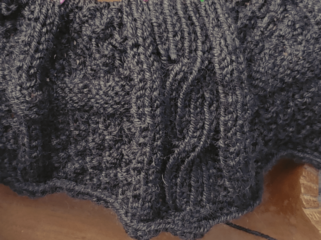 First I started the Dock and Cabin sweater. It’s a fiddly pattern, with cables and charts and lots of counting. It’s a fun challenge so far, but I can’t do it while helping kids lest I lose track of my knits and purls mid-row. I’m doing it in black, but the close-up photo has a filter so you can see the stitches better.