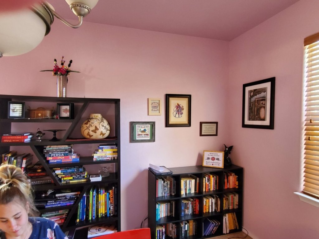It’s been a brutally busy summer so far. There have been some spectacularly bad moments but a lot of good things, too. I finished painting the dining room and our upstairs hallway and alcove, rearranged our books and finally got a lot of our pictures hung up.