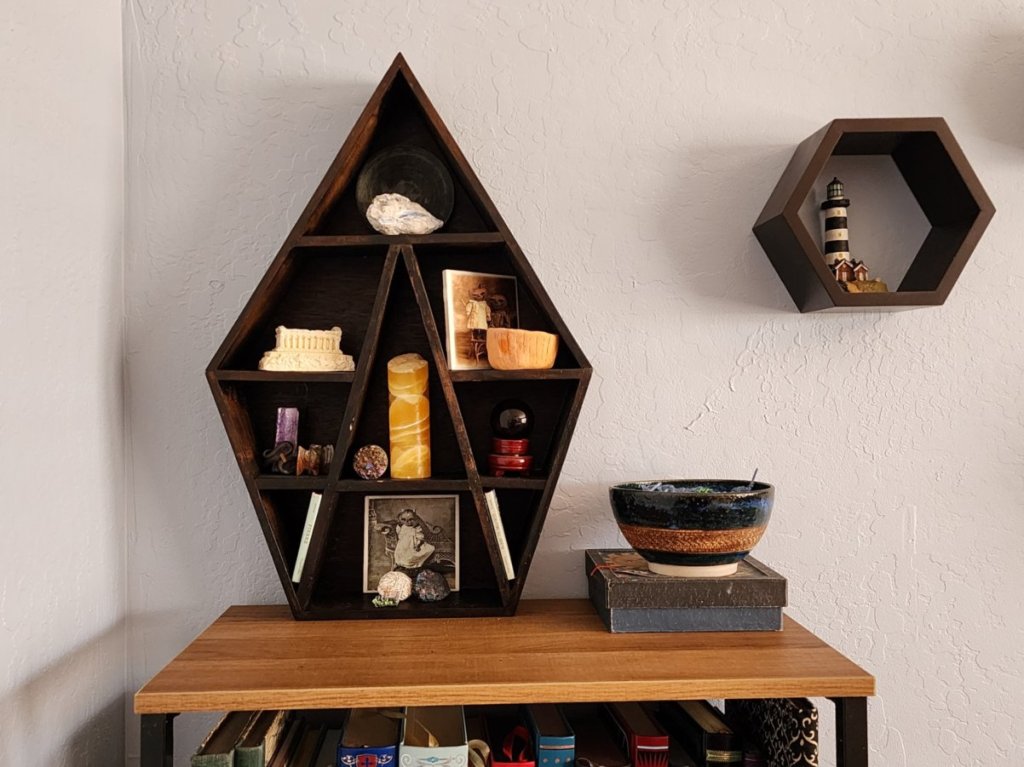 - I bought a new curio shelf. We liked the interesting shape of it. It wasn’t expensive, and we already had more than enough curios to fill it with.