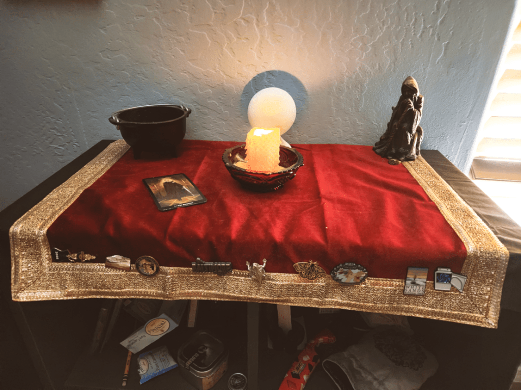 2. I also bought a new altar cloth. It was made in India, where they like their gold really golden. I love the deep red but usually silver trim is more my style. Still, I’m committing to this one, and I’ve already personalized it by sticking my collection of souvenir pins to the edge.