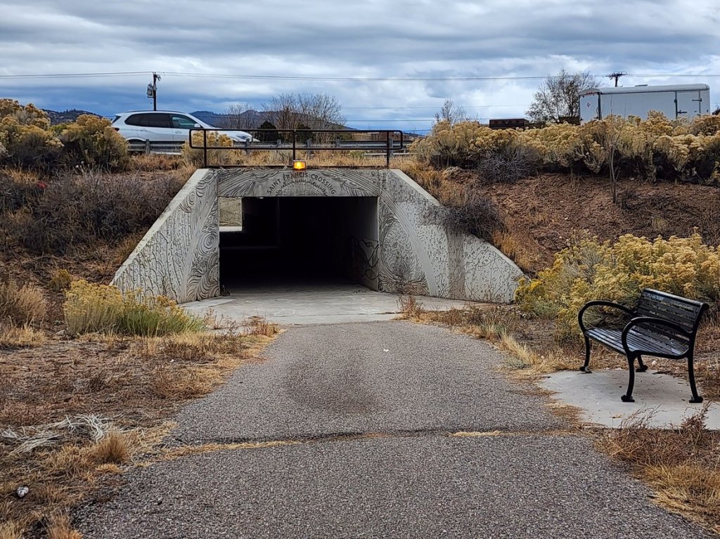 I was jogging up a long trail that winds all the way through town. I never really reach the end before turning back around, but this week I ventured a quarter mile farther than usual and reached the Saint Francis Crossing for the first time. It’s just an ordinary pedestrian underpass beneath a large road but, like so many ordinary things around here, it’s been thoughtfully covered in art.
