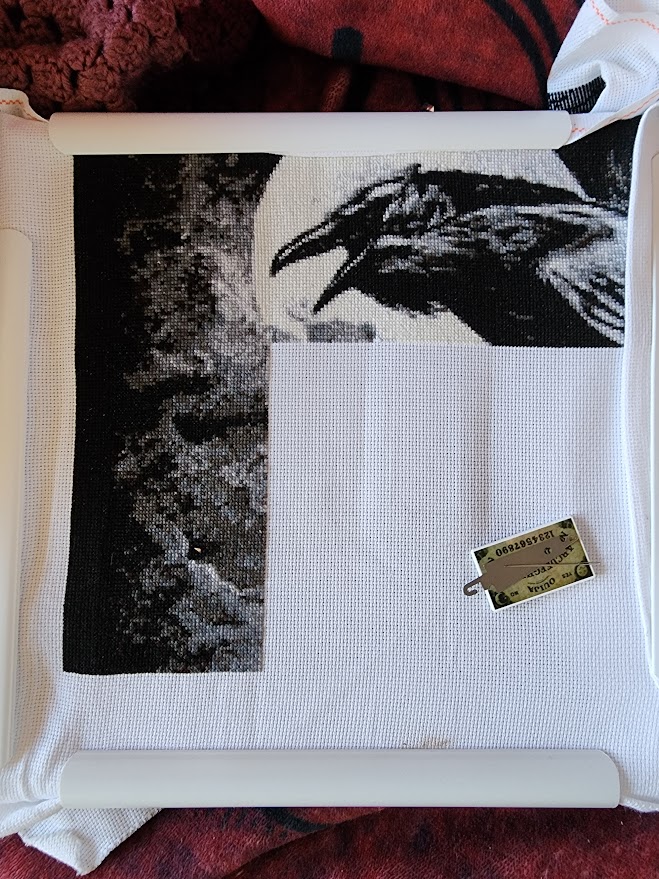 I’m sure you can see some knitting next to my current book up there. Last craft update, I was working on a page of my Poe-inspired raven cross stitch. I finished that page over the winter holidays and moved on to a small knitting project I’ve been looking forward to.