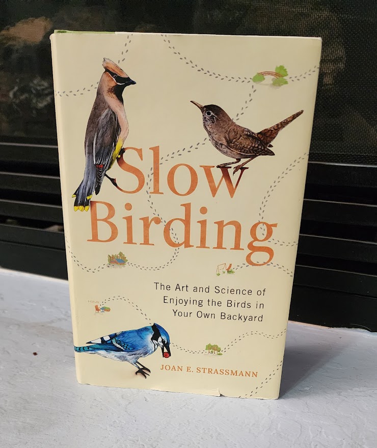 I just finished reading Slow Birding, by Joan Strassmann, and our bird drama was a perfect example of what Strassmann wants us to do. She wants us to slow down and really observe the natural world right around us instead of thinking of nature as something separate or exotic. Instead of spending long chapters explaining what a great idea this is, Strassmann picks about a dozen common birds she can see within a half hour from her Missouri home and writes about them. She describes where and when she sees them (in her backyard, local parks, nearby nature preserves), tells us interesting facts discovered by various scientists, and explains the experiments those scientists did to find out these facts.