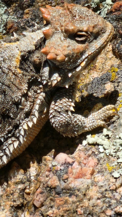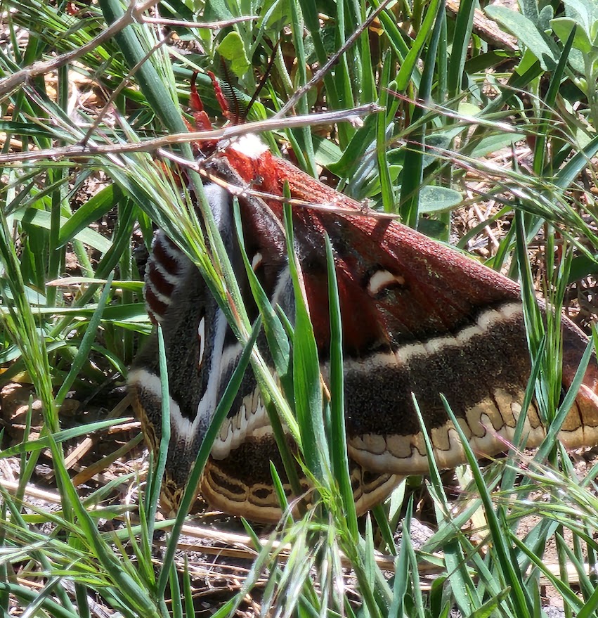 Aside from the rush of school ending and my painting project, I’ve managed some more day hiking. As the weather warms up, I’m seeing a lot of lizards and birds. This morning I went up one of the local peaks and got a peek at two chipmunks as I ate my lunch. They didn’t sit still long enough for a good picture, but later a horned lizard was kind enough (or lazy enough) to sit in my path long enough for some great shots. I also saw what I thought was a giant butterfly, but I just looked it up and it was a moth. A Cecropia Silk Moth, North America’s largest moth. According to the internet, it lives nearly everywhere in North America. Moths are very creepy and very beautiful, and I never expect to see them in daytime.