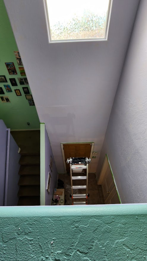 I might get the energy up to get some interior painting done. Last Saturday I finally started painting our entryway, which is a much bigger deal than it sounds. Our entryway is narrow, but the front wall reaches about ten meters (30 feet) straight up to the top of the second floor. We had to buy a very cool but very heavy new ladder to get all the way up there. There is no photo angle that really captures the height but I took a couple shots from our indoor balcony. The ladder, at full height, reaches way up to (and past) that window, which I very carefully covered with that sparkly window covering. I did a truly terrible job with the window covering, but I’m the only one in the house brave enough to climb up there so no one dares complain.