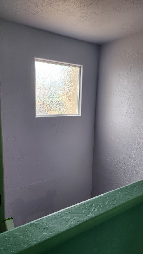 The photos don’t give a good sense of scale, but they do capture my color scheme pretty well. I’m very pleased with the pale lavender against the greens and the darker lavender we have near it. I’m carrying the color onto the ceiling of our second floor, but I ran out of time to finish Saturday. If you visit my house in the next few weeks, just maybe don’t look up. I’ll get it finished one of these days.